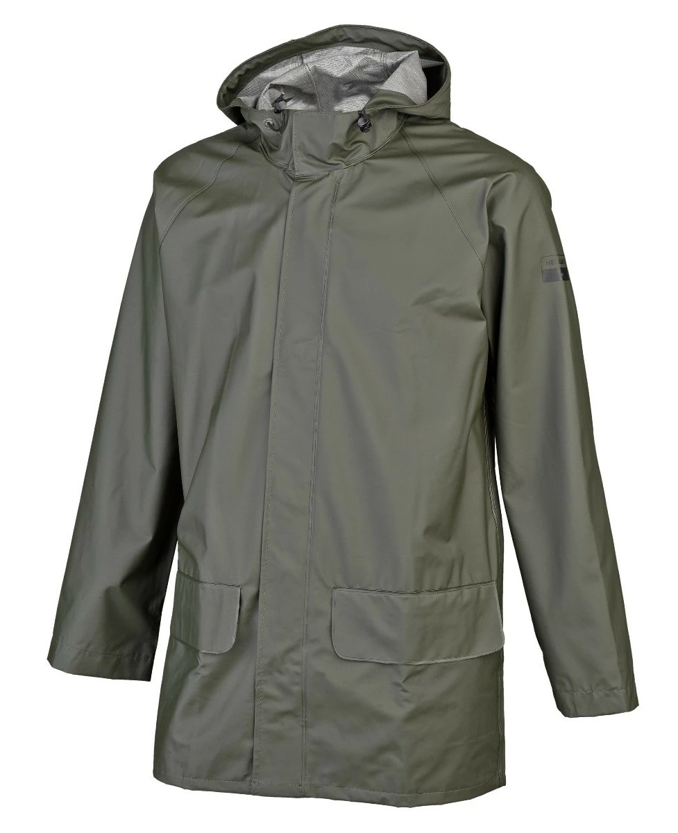 Kestävä Helly Hansen sadetakki, kevyestä ja joustavasta materiaalista. Takissa on kiinteä huppu nyörikiinnityksellä. Edessä on painonappikiinnitys ja isot läppätaskut.
