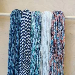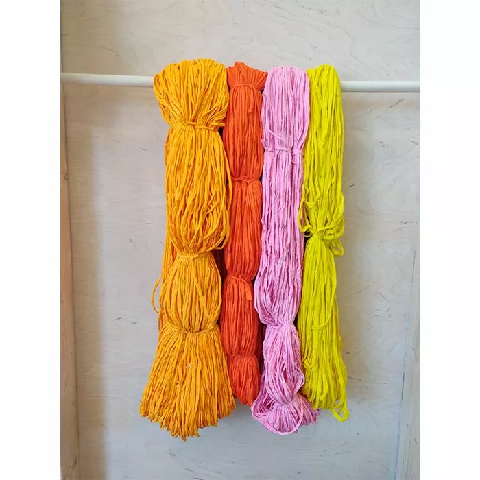 Huom. Lajitelmakuva on suuntaa antava. Lajitelman värit vaihtelevat ja poikkeavat aina jonkin verran kuvan viitteellisistä väreistä. Myös vyyhtien määrä vaihtelee neljästä kuuteen, joten kaikkia kuvan sävyjä ei välttämättä ole kaikissa lajitelmissa. Lajitelman vyyhdit eivät ole keskenään samanvärisiä, setti saattaa sisältää esim. useaa eri sinisen sävyä. Myöskään setit eivät ole keskenään yhtenäisiä, eli jos tilaat esimerkiksi kaksi SINISET-settiä, niiden sisältämä vyyhtilajitelma voi poiketa toisistaan. Puuvillatrikoon paksuus voi vaihdella ja se saattaa sisältää solmuja.