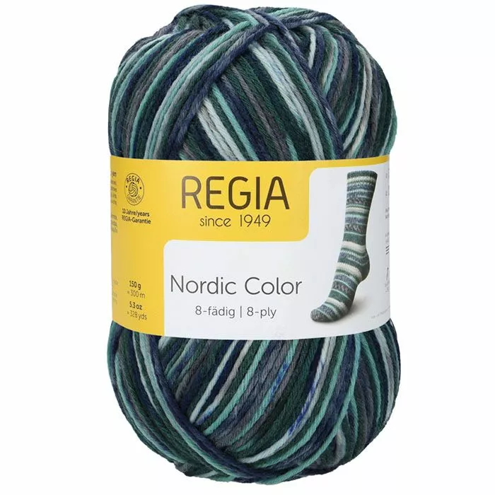 Laadukkaasta paksusta 8-säikeisestä Regia Color -sukkalangasta neulot nopeasti kauniit itseraidoittuvat villasukat. Yksi 150 g kerä riittää aikuisten koon sukkapariin. Konepesun kestävä.