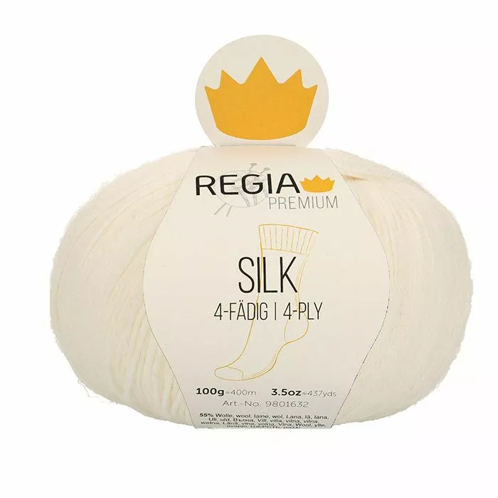Regia Premium Silk on ylellinen sukkalanka merinovillaa, silkkiä ja polyamidia. Värjäämättömät silkkikuidut luovat lankaan hienoisen meleeratun sävyn. Pehmeä ja ihoa hellivä lanka sukkiin tai muihin neuletöihin.