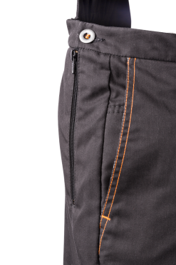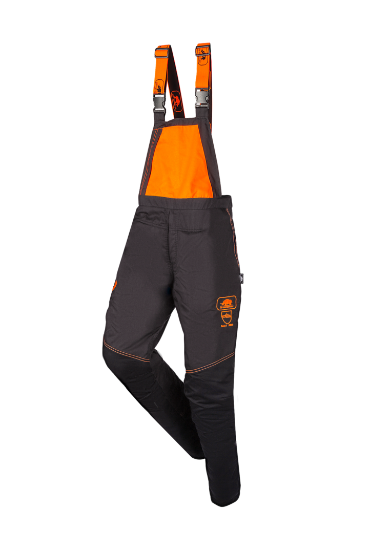 Luokka 1 tyyppi A mukainen viiltosuoja-avohaalari. Housuissa on tilava rintatasku, sivutaskut ja tukevat olkaimet. Elastinen vyötärö.