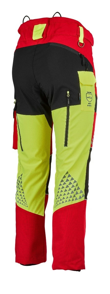 Housuissa on 4-kerroksinen Araneo viiltosuoja edessä. Elastinen ja tarralla säädettävä vyötärönauha takaa hyvän istuvuuden ja korotettu selkämys pitää kylmän loitolla. Edessä ja takana on heijastimet lisäämään työturvallisuutta. Yläosan materiaali on vettä- ja likaahylkivää ja alaosa on vahvistettu Ripstop-kankaalla. Polviosat on ergonomisesti muotoillut ja vahvistetut. Takana on pitkät tuuletusvetoketjut ja edessä vetoketjulliset sivutaskut. Housuissa on reisitasku velcro-tarralla sekä tasku matkapuhelimelle. Lahkeissa lumilukot ja vyötäröllä kangaslenkit olkaimille.